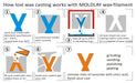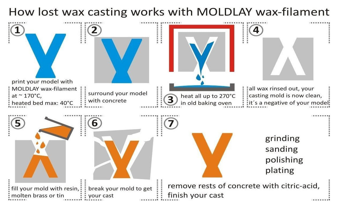 CC-Products Moldlay has an excellent dimensional stability and leads to practically no warping. This material is hard and solid at room temperature. Once the mould is heated to 270°C, Moldlay becomes very liquid and spills out of the form. You can find pictured instructions for the usage of Moldlay wax filament in our gallery.